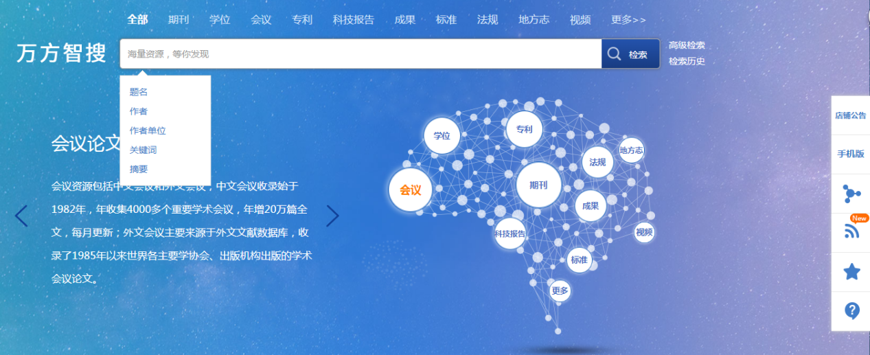 万方知识服务平台收录了包括期刊、学位、会议科技报告、专利、标准、科技成果、法规、地方志、视频等10余种资源类型在内的3亿多篇中外文学术文献,全面覆盖各学科、各行业。基于海量高品质知识资源和知识发现技术,万方智搜为用户提供专业文献检索、多途径全文获取、云端文献管理及多维度学术分析等功能,全面服务于用户的科研创新。