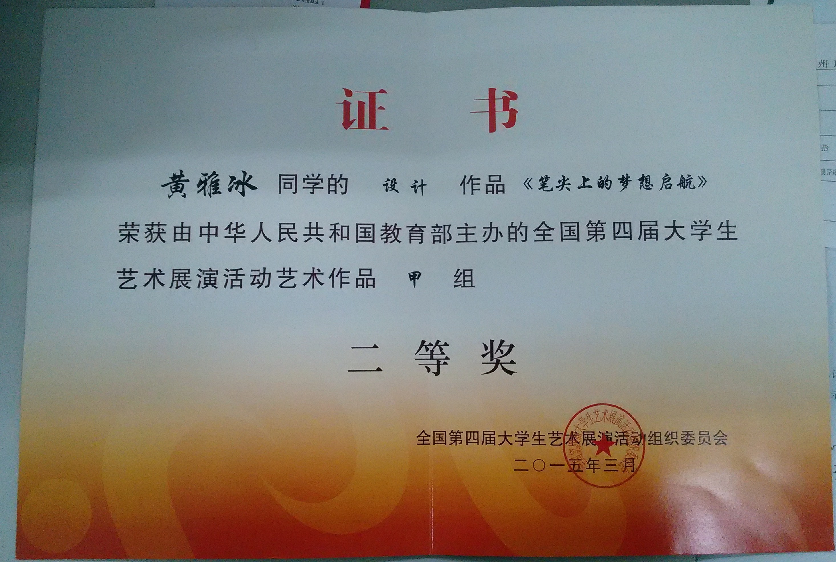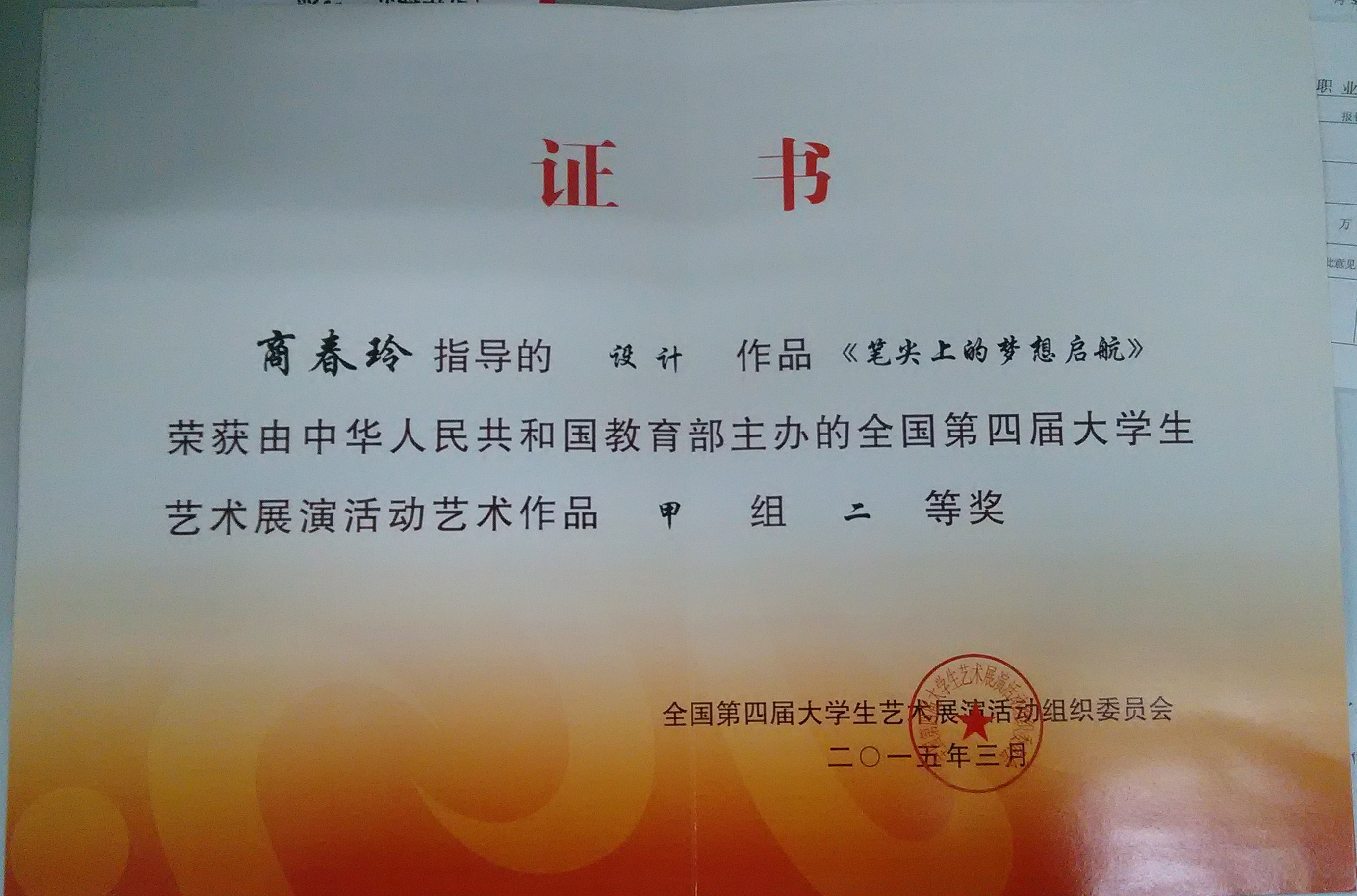 2月26日至3月2日,由教育部和天津市人民政府主办的全国第四届大学生艺术展演现场决赛在天津举行。由院团委组织并选送的人文系学生黄雅冰的艺术作品《笔尖上的梦想启航》(指导教师:商春玲)荣获由中华人民共和国教育部主办的全国第四届大学生艺术展演活动艺术作品甲组二等奖,此前该作品已获我省第四届大学生艺术节艺术作品一等奖,这是我院学生艺术类作品 在全国大学生艺术展演活动中获得的最好成绩。