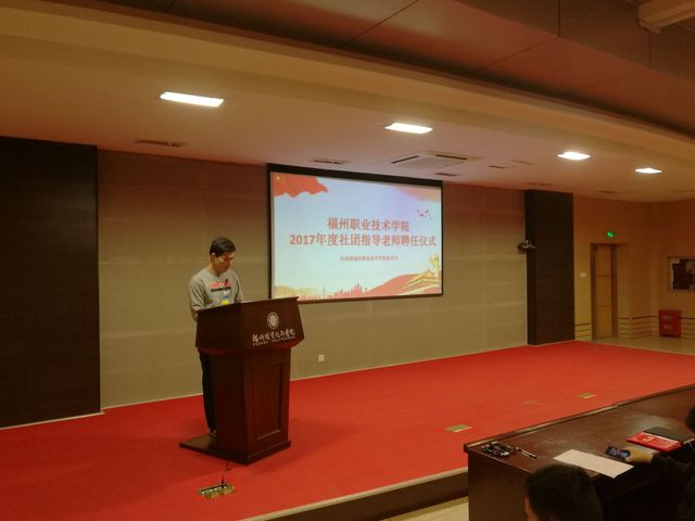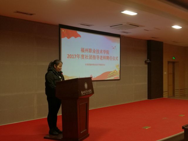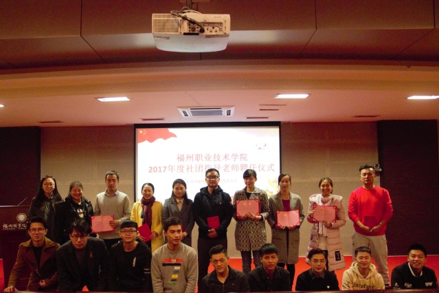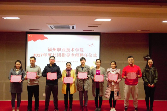 会上,校团委副书记陈洁宣读了福州职业技术学院2017年度社团指导老师名单,团委林芊老师为聘任的指导教师颁发受聘证书并合影留念。就业社团社长陈永泉代表学生社团发言,他承诺将努力把社团的工作建设好,推向新的高度,让社团更好地服务同学。