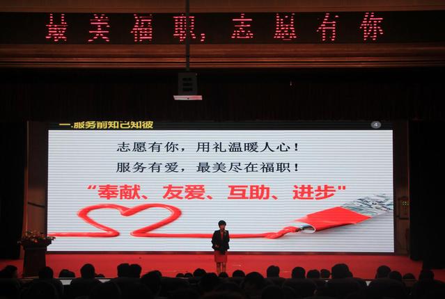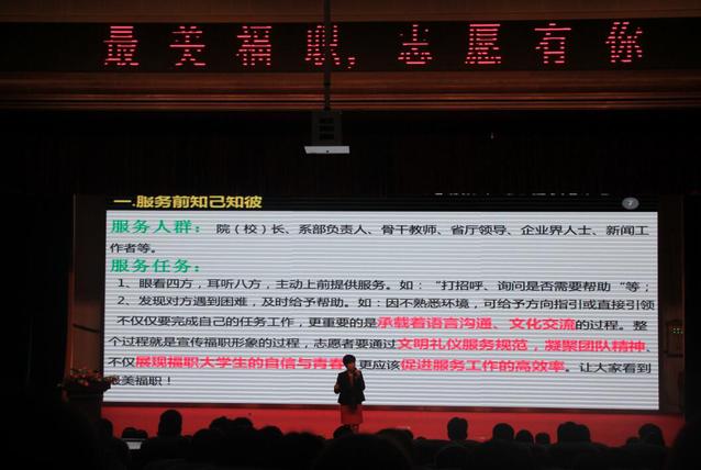为确保安全有序、优质高效地完成全国高职院校校长联席会的接待工作,2018101719点,综合楼礼堂召开了志愿服务培训大会。本次培训由公教部的曹英主讲,来自各学院近500名志愿者参加了此次会议。