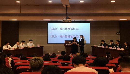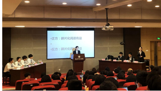 经过初赛与复赛的比拼,商学院代表队和文化创意学院代表队进入了决赛环节。两支队伍围绕着碎片化阅读的利弊展开辩论,各位辩手思路清楚,反应敏捷,充分展示了自身的才华和团体合作精神。最终,商学院代表队荣获一等奖,文化创意学院代表队获得二等奖,交通工程学院与国际教育学院获得三等奖。