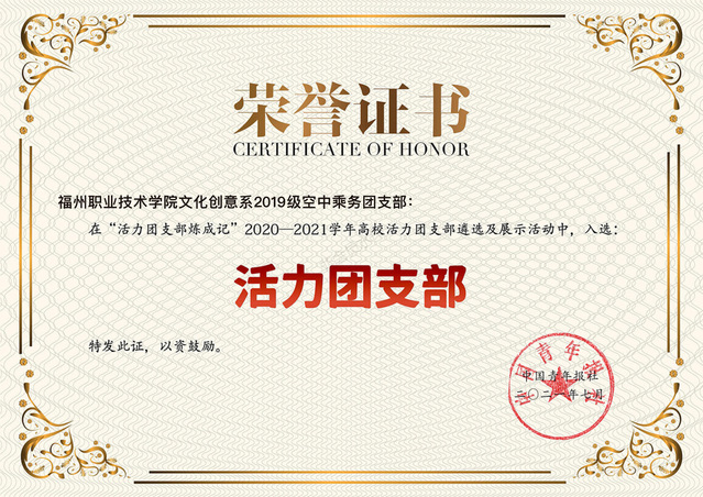 近日,中国青年报社在团中央基层建设部指导下开展“活力团支部炼成记”2020—2021学年高校活力团支部遴选及展示活动,我校2019级空中乘务团支部经校级申报、省级初评、展示点赞、全国终审等环节从全国高校中脱颖而出,成为全国1000个获此荣誉的团支部之一。