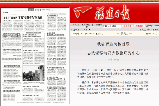 本报讯(记者张颖) 3月31日,我省首个高职院校马克思主义学院揭牌仪式暨福建省职业院校思政课移动云大数据研究中心签约授牌仪式,在福州职业技术学院举行。
