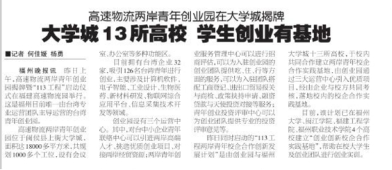 高速物流两岸青年创业园位于闽侯县上街大学城,面积达18000多平方米,共规划1000多个工位,设有会议室、办公室等多种功能区。