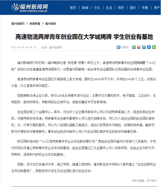 福州新闻网7月5日讯(福州晚报记者 何佳媛 杨勇)昨日上午,高速物流两岸青年创业园揭牌暨“113工程”启动仪式在福建高速物流园举行。这是福州目前唯一由台湾专业运营团队主导运营的台湾青年创业园。