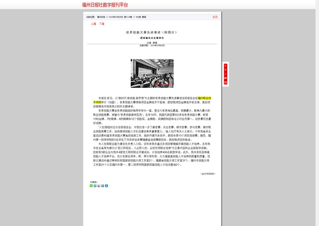 世界技能大赛由世界技能组织每两年举办一届,是当今世界地位最高、规模最大、影响力最大的职业技能竞赛,被誉为“世界技能奥林匹克”。去年10月,我国代表团第4次参加世界技能大赛,斩获15枚金牌、7枚银牌、8枚铜牌和12个优胜奖,金牌数、奖牌数和团体总分均位列第一,创参赛历史最好成绩。