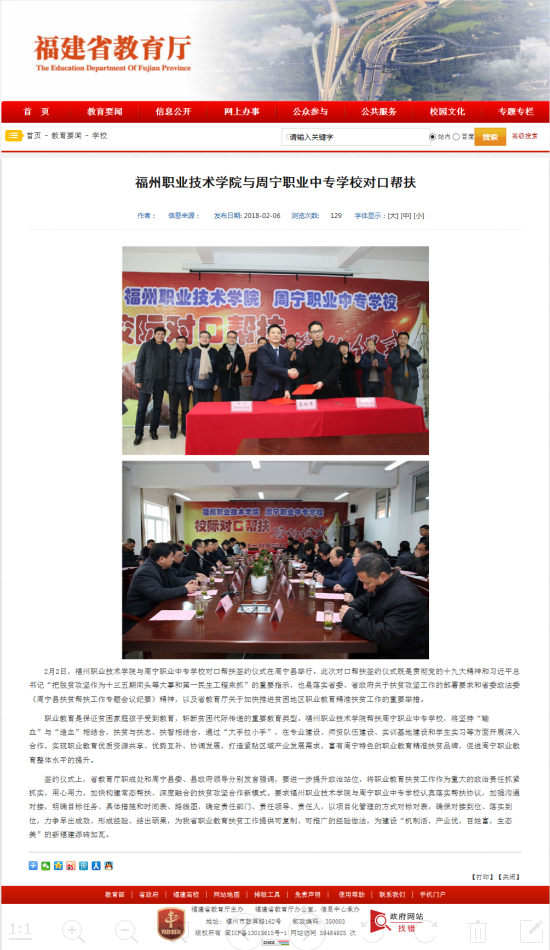 2月2日,福州职业技术学院与周宁职业中专学校对口帮扶签约仪式在周宁县举行。此次对口帮扶签约仪式既是贯彻党的十九大精神和习近平总书记“把脱贫攻坚作为十三五期间头等大事和第一民生工程来抓”的重要指示,也是落实省委、省政府关于扶贫攻坚工作的部署要求和省委政法委《周宁县扶贫帮扶工作专题会议纪要》精神,以及省教育厅关于加快推进贫困地区职业教育精准扶贫工作的重要举措。