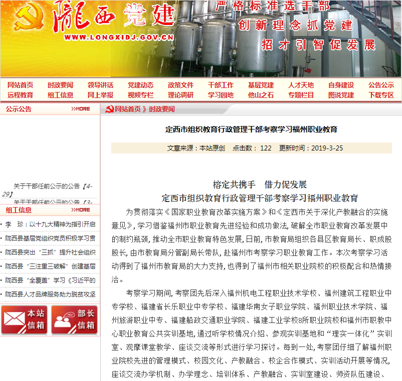 为贯彻落实《国家职业教育改革实施方案》和《定西市关于深化产教融合的实施意见》,学习借鉴福州市职业教育先进经验和成功做法,破解全市职业教育改革发展中的制约瓶颈,推动全市职业教育特色发展,日前,市教育局组织各县区教育局长、职成股股长,由市教育局分管副局长带队,赴福州市考察学习职业教育工作。本次考察学习活动得到了福州市教育局的大力支持,也得到了福州市相关职业院校的积极配合和热情接洽。