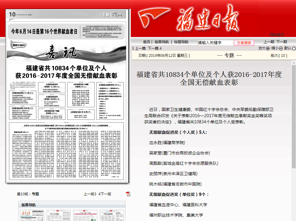 近日,国家卫生健康委、中国红十字会总会、中央军委后勤保障部卫生局联合印发《关于表彰2016—2017年度无偿献血奉献奖金奖等奖项获奖者的决定》,福建省共10834个单位及个人受表彰。