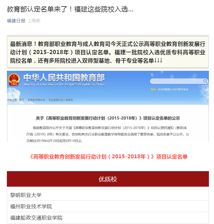 最新消息!教育部职业教育与成人教育司今天正式公示高等职业教育创新发展行动计划(2015-2018年)项目认定名单。福建一批院校入选优质专科高等职业院校名单,还有多所院校进入双师型基地、骨干专业等名单↓↓↓