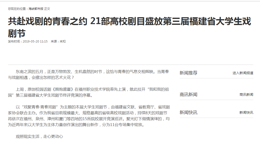 上周,原创校园话剧《拥抱盛夏》在福州职业技术学院率先上演,就此拉开“我和我的祖国”第三届福建省大学生戏剧节终评竞演的序幕。