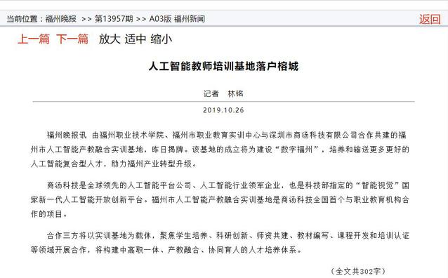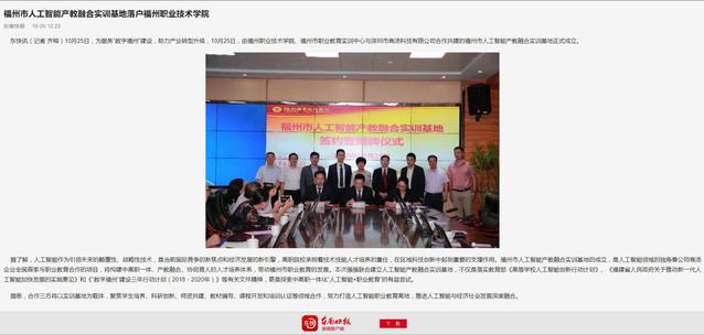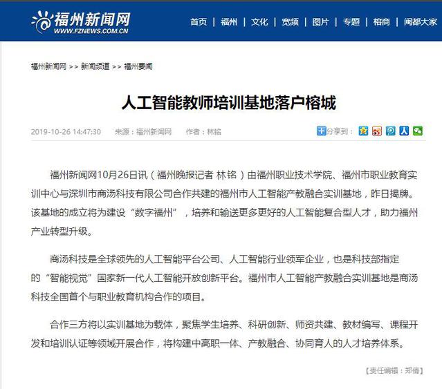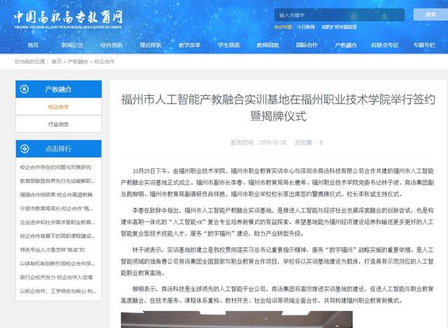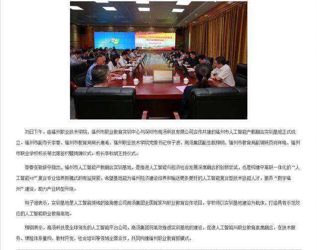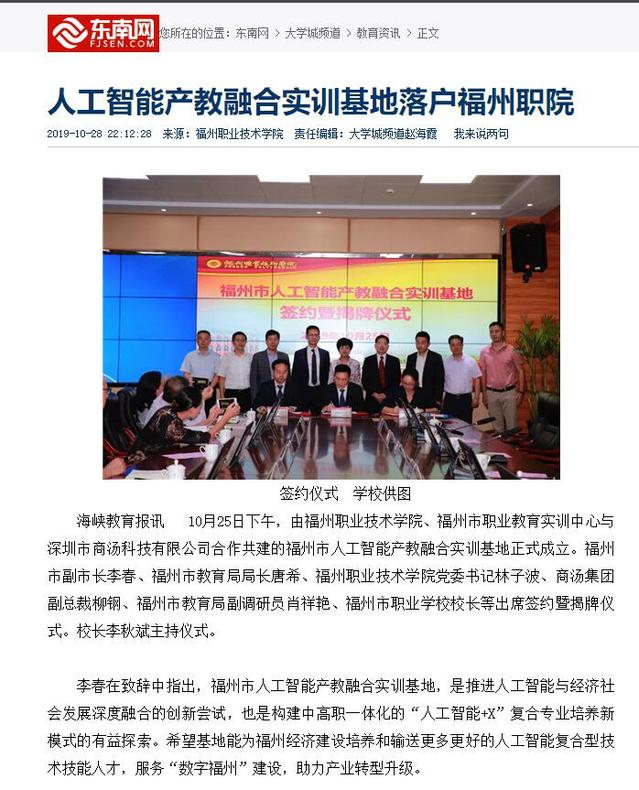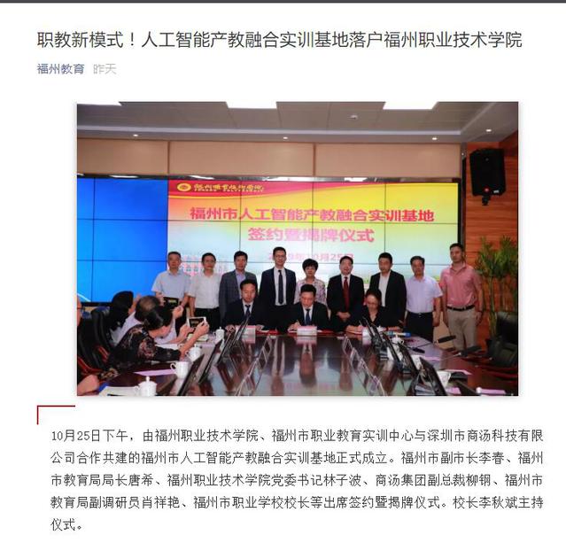 10月25日,福州职业技术学院、福州市职业教育实训中心与深圳市商汤科技有限公司合作共建的福州市人工智能产教融合实训基地正式成立。