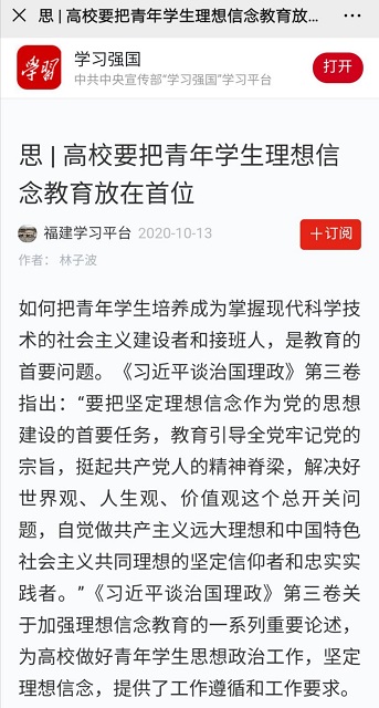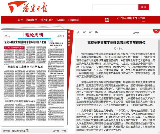 2020年10月12日-13日,《福建日报》(理论周刊·求是)、学习强国福建学习平台等媒体,刊发我校党委书记林子波文章《高校要把青年学生理想信念教育放在首位》。