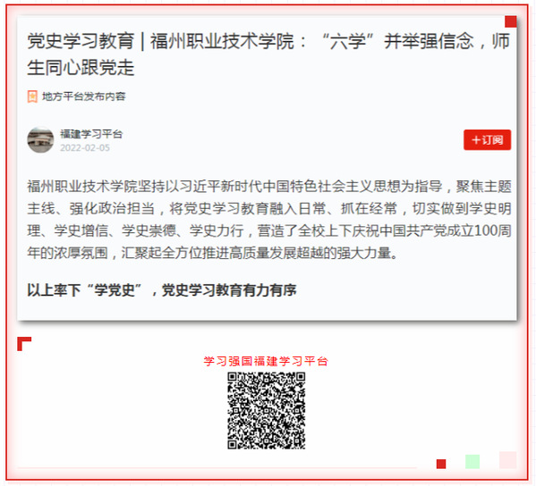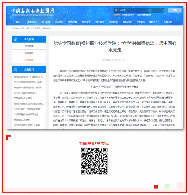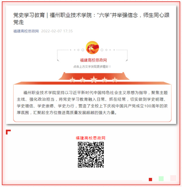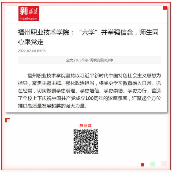 近期,学习强国福建平台、新福建、福建高校思政网、中国高职高专网等媒体以《福州职业技术学院:“六学”并举强信念,师生同心跟党走》为题对我校党史学习教育活动进行报道。(扫描图片下二维码查看原文)