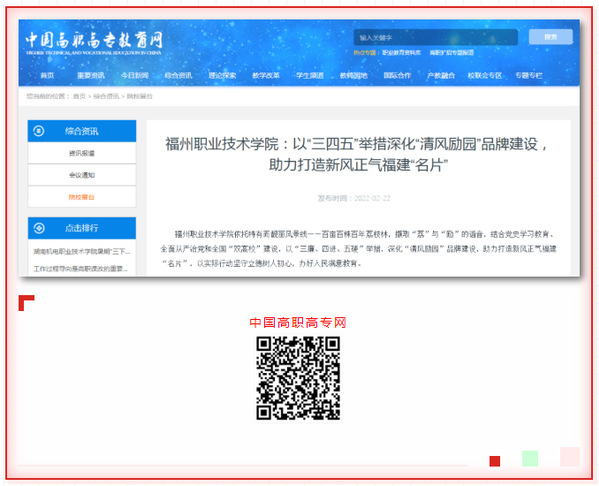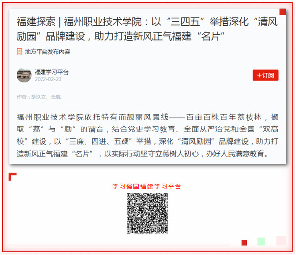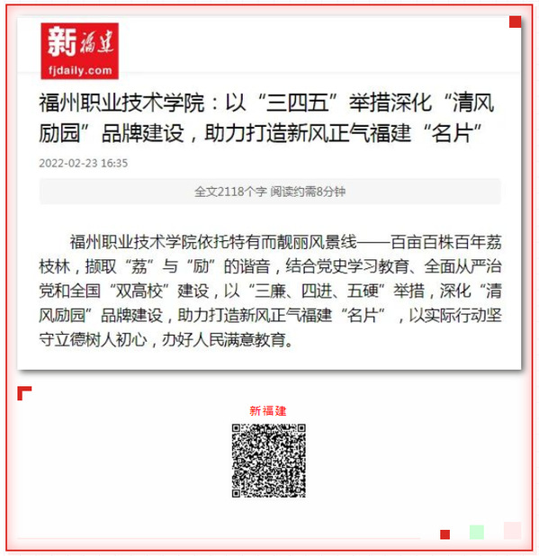 近日,学习强国福建学习平台、新福建、中国高职高专网等媒体以《福州职业技术学院:以“三四五”举措深化“清风励园”品牌建设,助力打造新风正气福建“名片”》为题对我校“清风励园”品牌建设工作进行报道。(扫描图片下方二维码查看原文)