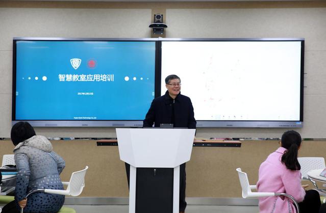 培训会开始,欧阳副校长在会上寄予了希望,他表示,“智慧教室”是一种“互联网+”教学模式和先进的信息技术手段相结合的、富有智慧的课堂教学环境。学校高度重视教学质量,努力为师生打造了良好的教学环境,希望教师能够积极主动地探索,打造更加智能高效,富有智慧的课堂。