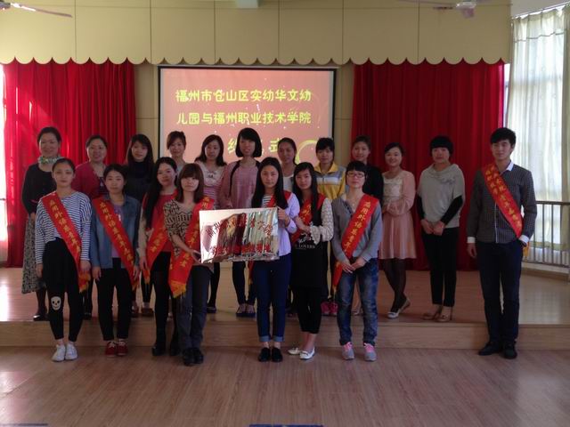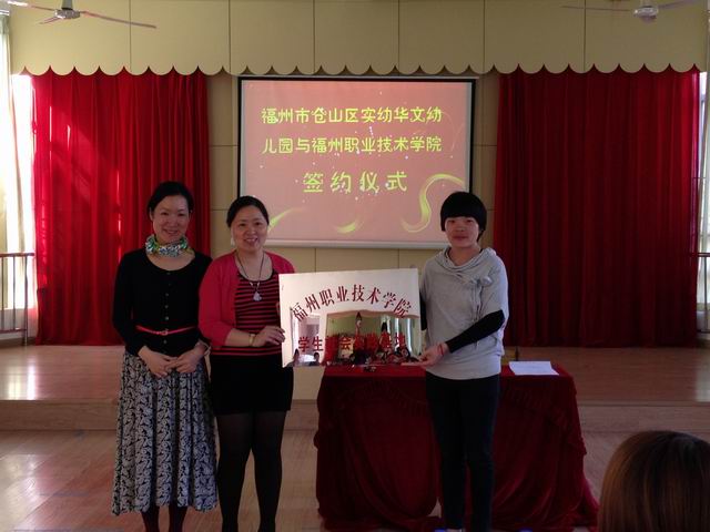 为适应社会对幼儿外语教育方向人才的需求,培养合格人才,密切校企合作,建立稳定的学生社会实践基地,经过双方的积极筹备,福州职业技术学院应用外语系与福州市仓山区实幼华文幼儿园于2014年4月11日在实幼华文幼儿园举行学生社会实践基地签约暨授牌仪式。应用外语系辅导员韩燕霞和实幼华文幼儿园的黄婧副园长分别代表校企双方进行了签约并互授牌匾。参加签约活动的还有系辅导员黄燕姿和2013级部分学生。