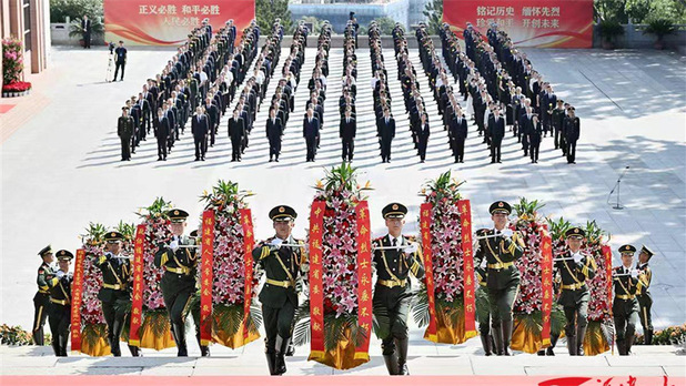 伴随着深情的《献花曲》,18名礼兵稳稳抬起花篮,缓步走向纪念碑,整齐摆放在纪念碑基座上。