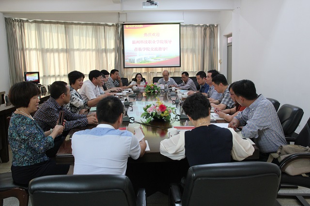 2014年10月14日下午,温州科技职业学院院长徐和昆、副院长谢志远一行12人莅临学院考察交流。学院林承超院长、林福荣副书记、刘松林副院长、詹碧卿副院长及有关部门、系部负责人热情接待了徐院长一行。