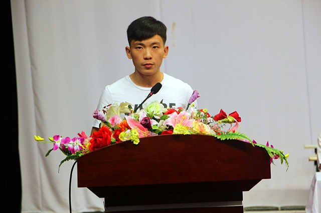 应用外语系2015级商务英语三班的邹仕珏同学代表新生发言,他表达了对大学学习和大学生活的决心,并表示将尽快融入大学生活,恪守“明德、利器、厚实、笃行”的校训,努力学习,锐意进取,开拓创新。
