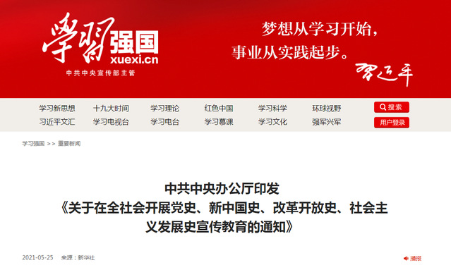 新华社北京5月25日电 近日,中共中央办公厅印发《关于在全社会开展党史、新中国史、改革开放史、社会主义发展史宣传教育的通知》,对在中国共产党成立100周年之际开展“四史”宣传教育作出安排部署。